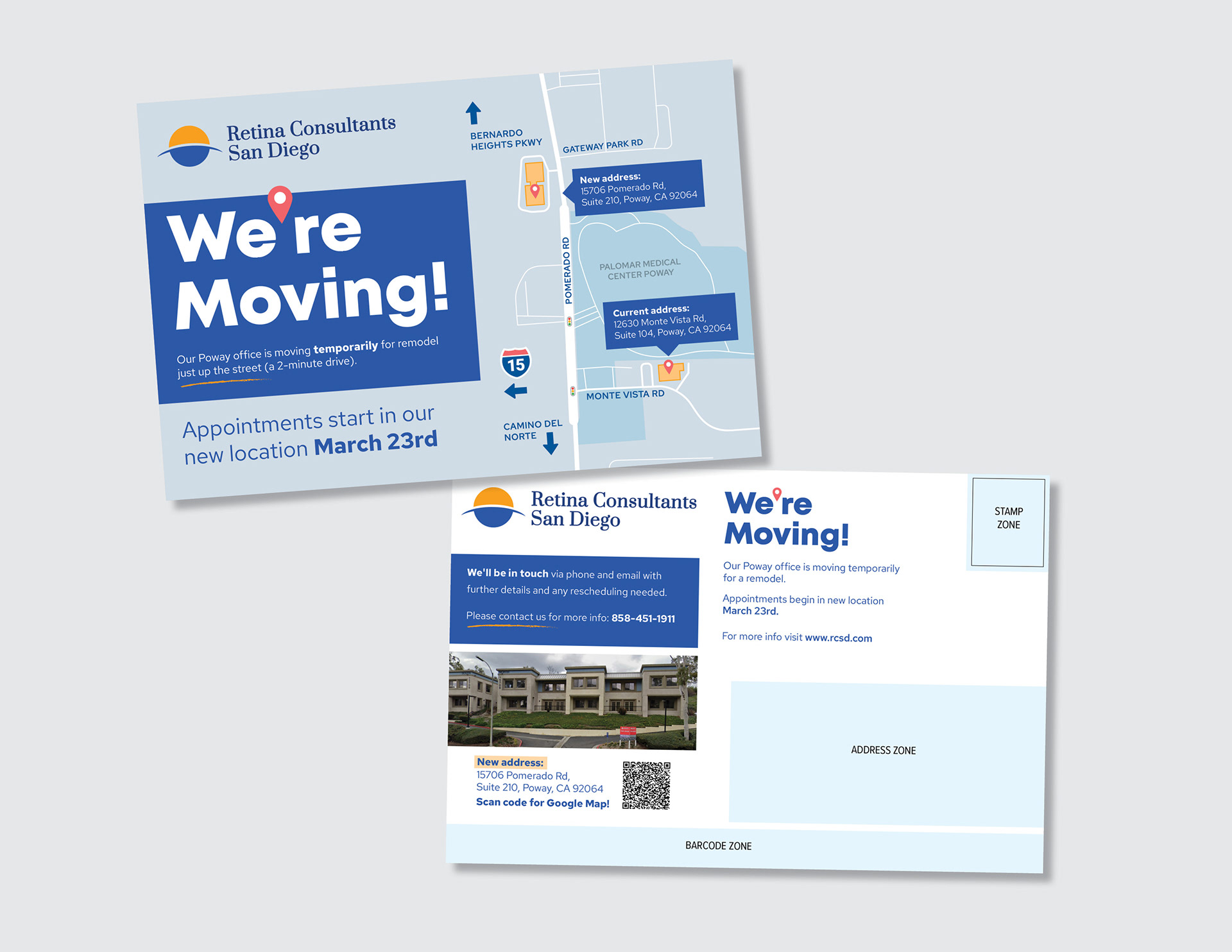 Retina Consultants San Diego is temporarily moving one of their San Diego office locations and needed to create communications pieces to share the news with their respective patient base. The challenge was to create communications that were clear and accessible by RCSD's client demographic which includes special emphasis on text visibility and clear directions independent of mobile device usage.