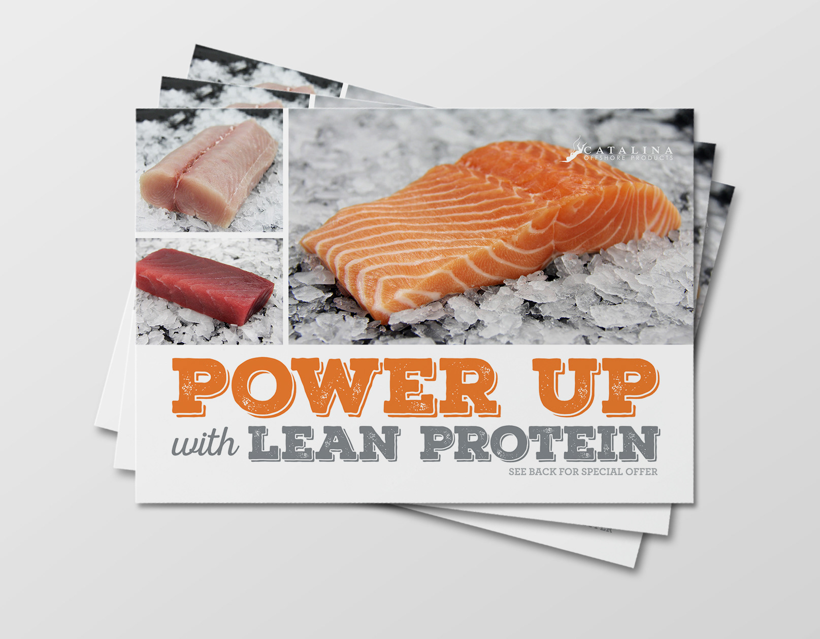 Catalina Offshore Products provides premium seafood sourced directly from local San Diego fisherman. The client was looking to create a promotional postcard to leave in a nearby newly opened gym to spread awareness on the healthy and fresh source of protein around the block—brilliant! The client wanted to use punched up typography and to showcase the freshness of the fish products offered.
